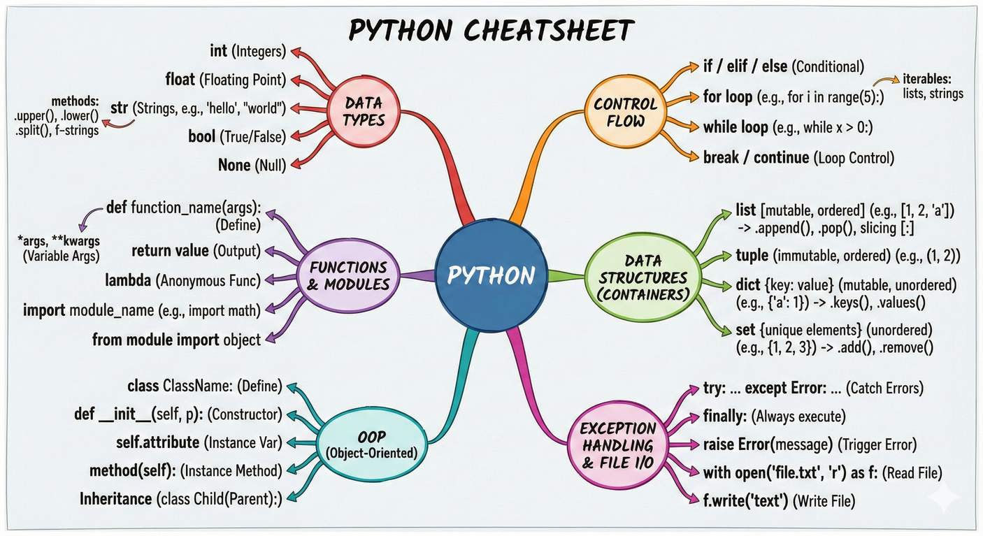 This cheat sheet provides an exhaustive overview of the Python programming language, covering essential syntax, data structures, functions, modules, and best practices for efficient development. It aims to be a one-stop reference for common tasks.